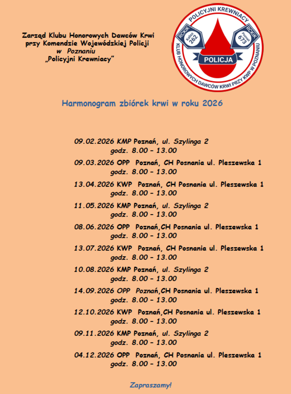 Harmonogram zbiórek krwi 2026 Data publikacji: 09.02.2026